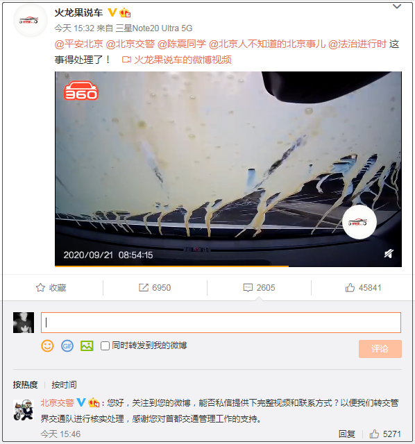 相关视频在网络流传后引发众怒。21日下午,@北京交警 给最早发布视频的微博网友留言:“您好,关注到您的微博,能否私信提供下完整视频和联系方式?以便我们转交管界交通队进行核实处理,感谢您对首都交通管理工作的支持。”